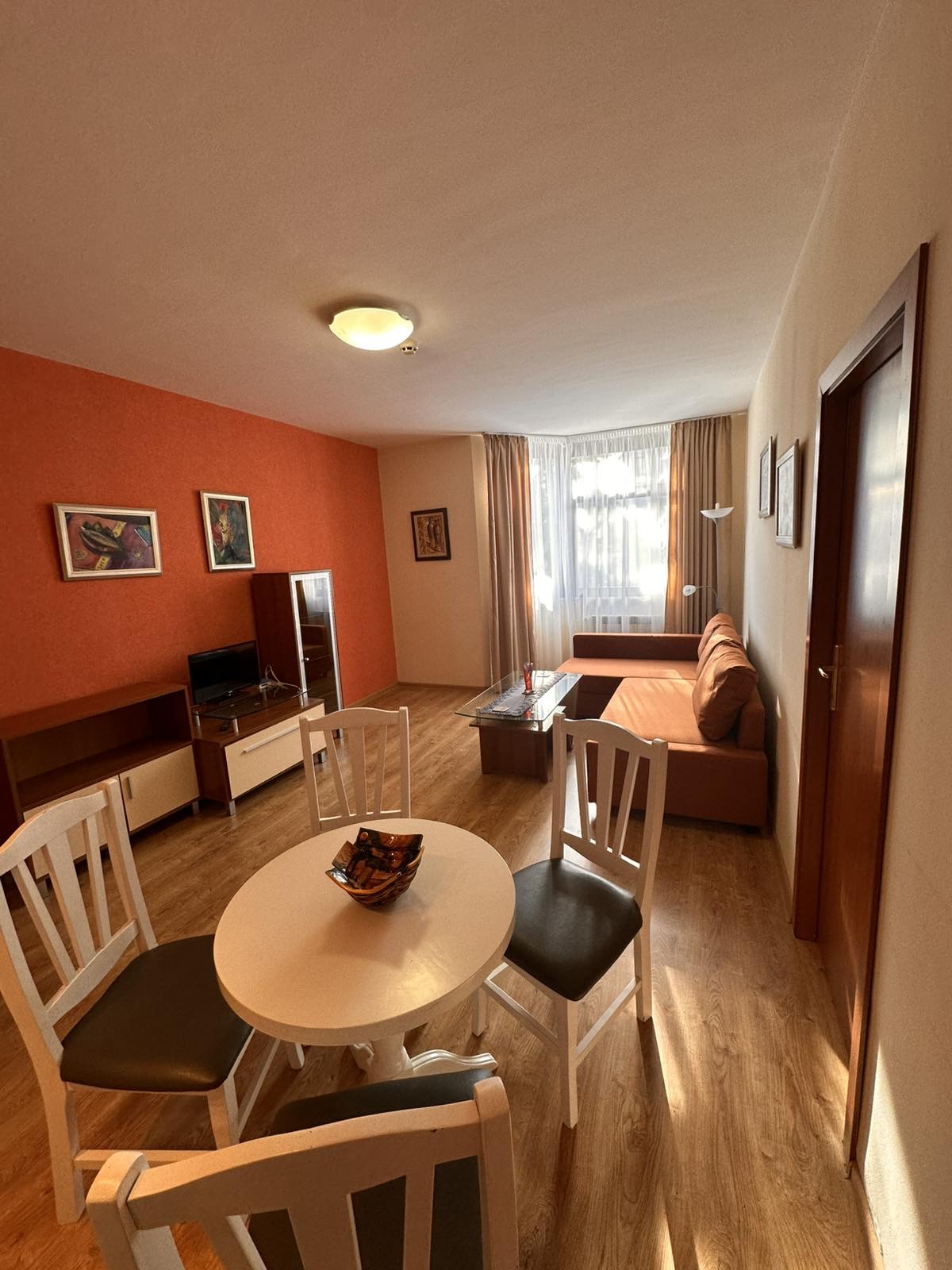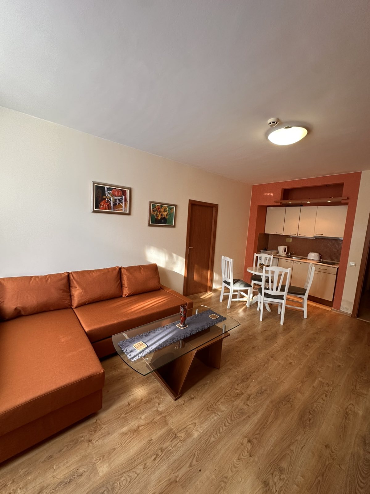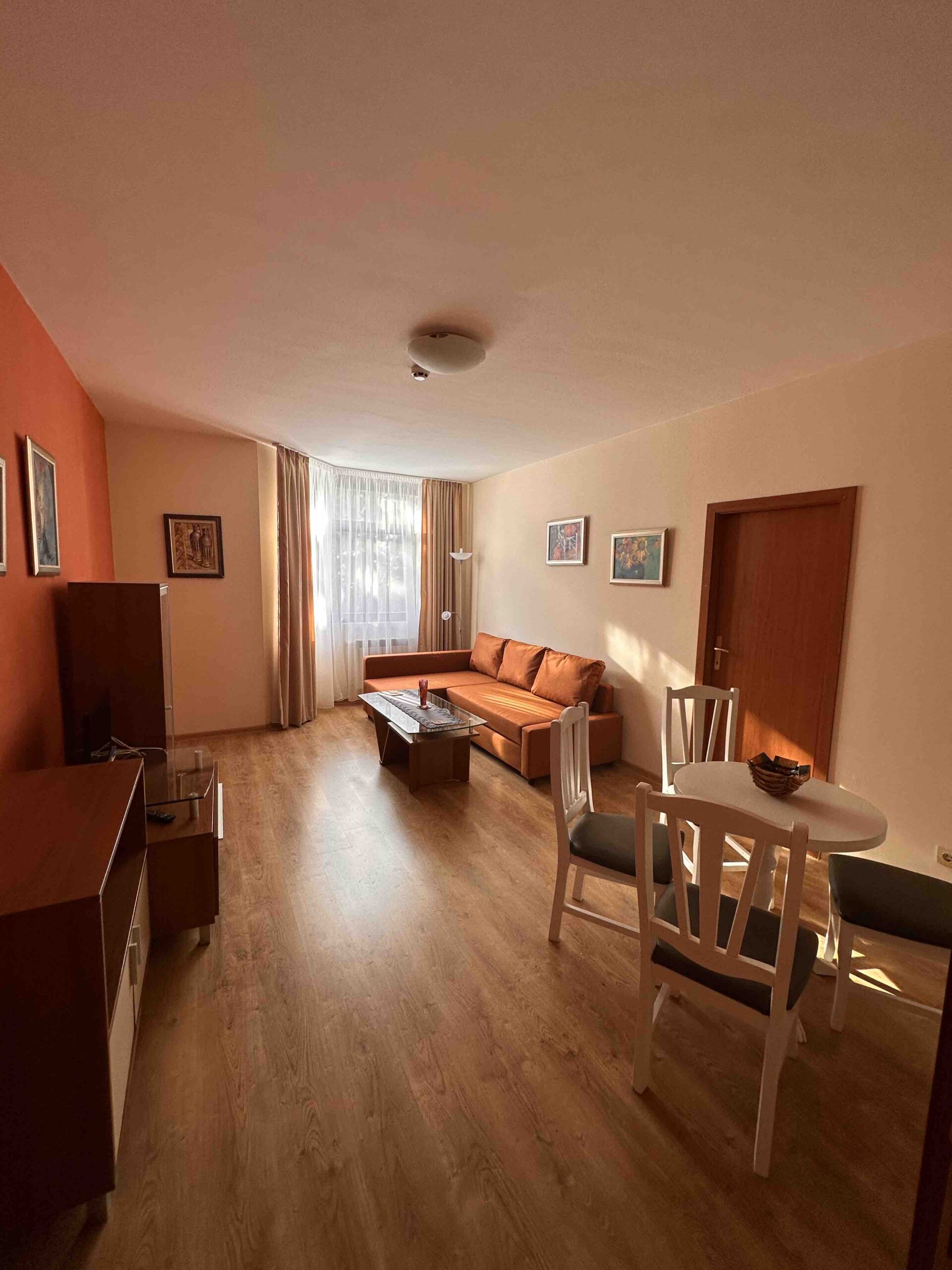 Accommodation: Apartment 504 is situated on the 5th floor of Flora main building with direct lift access to all indoor hotel facilities and overlooks the car park and Rila ski slopes. The apartment comfortably accommodates 4 people. Comprises small hallway with storage space, lounge with sofa bed including mattress topper, cable TV. Smart fully equipped kitchen area with 2 hot plates, fridge, kettle, toaster and coffee-maker, dining table for 4 people. Two bathrooms – one with shower cabin and the other with bath. Spacious bedroom with king size bed, ample storage and sofa. Sunny balcony offers green view and fresh air. The apartment is centrally heated. Cotton bedding and towels provided. Cleaning schedule: