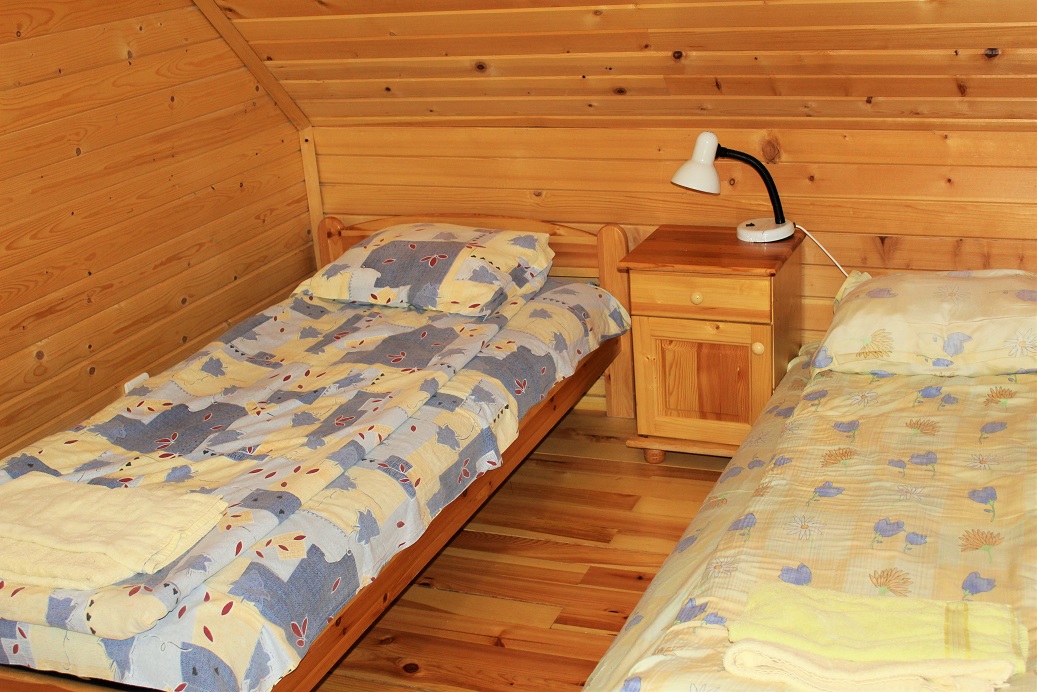 Bedroom 1 – Separate Double Bedded room with side cabinet, clothes rack and wall mounted coat hangers.