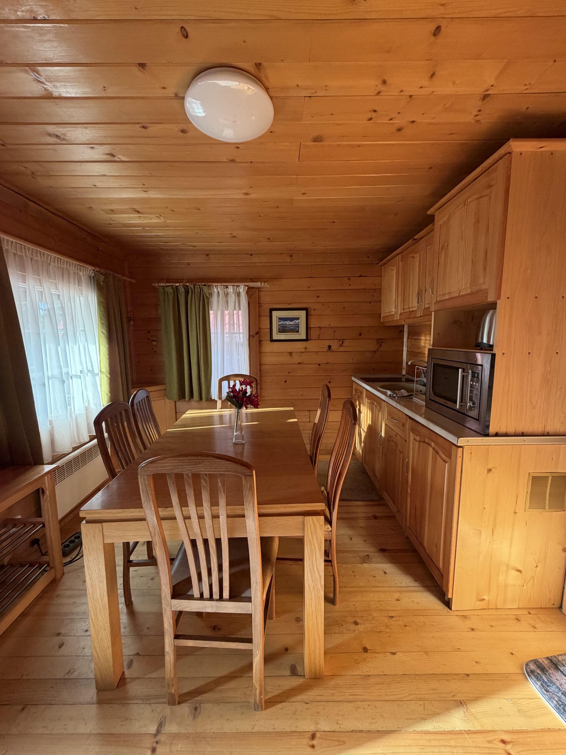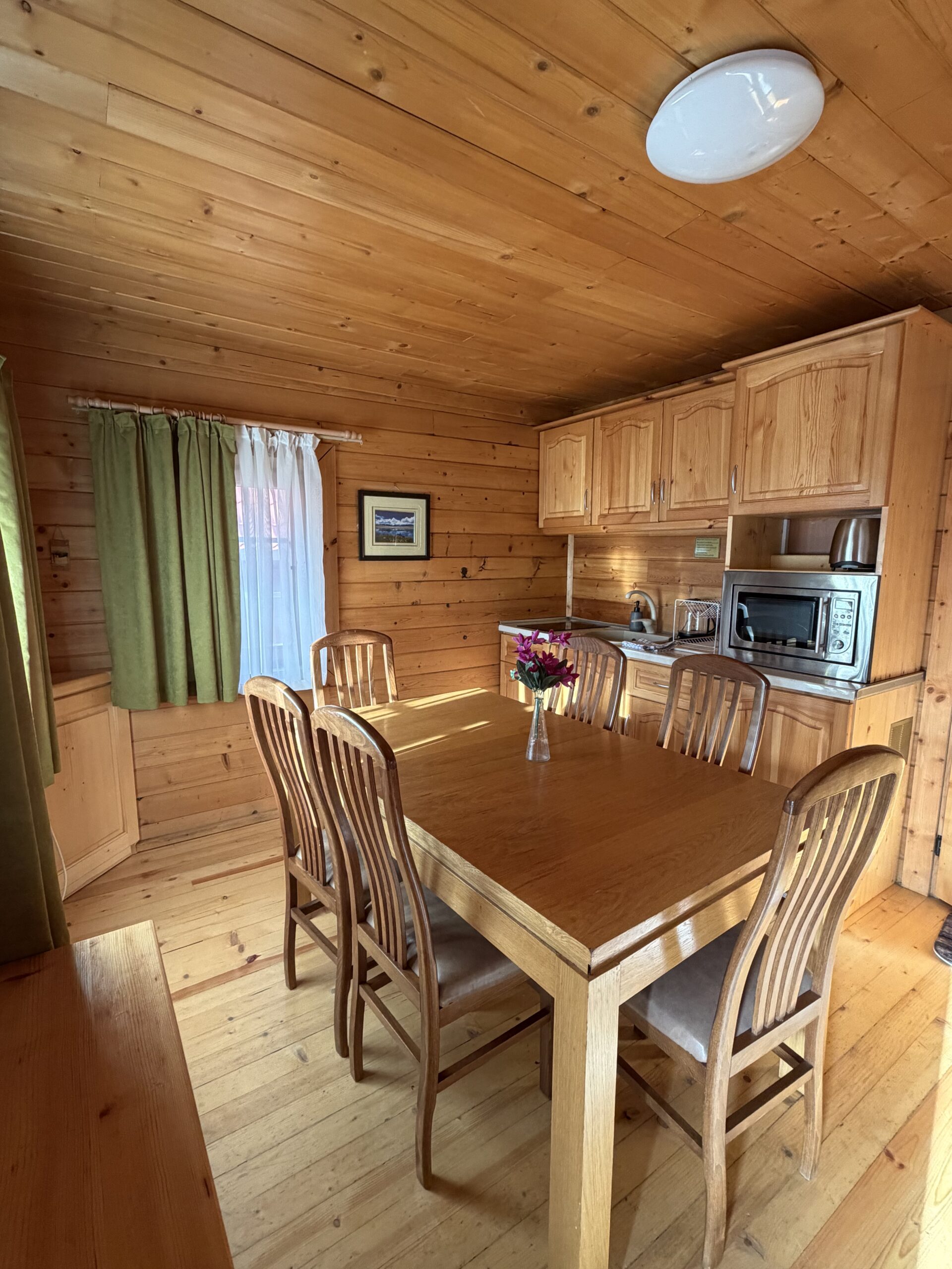 Dining Area – Comprising Kitchenette with built in sink and drainer, two ring electric cooker, toaster, kettle, coffee machine and microwave. Also pine table and chairs for 6 people.