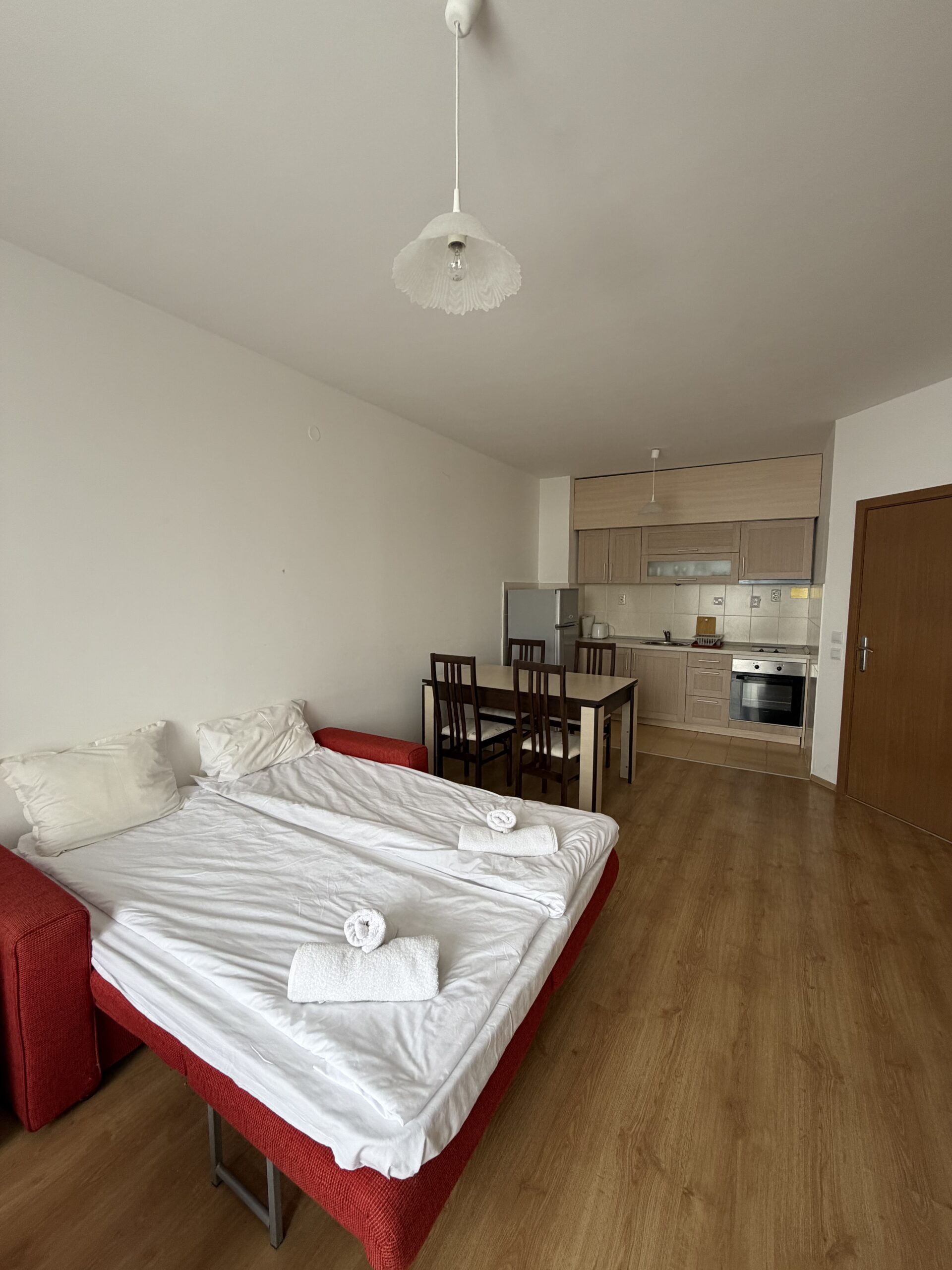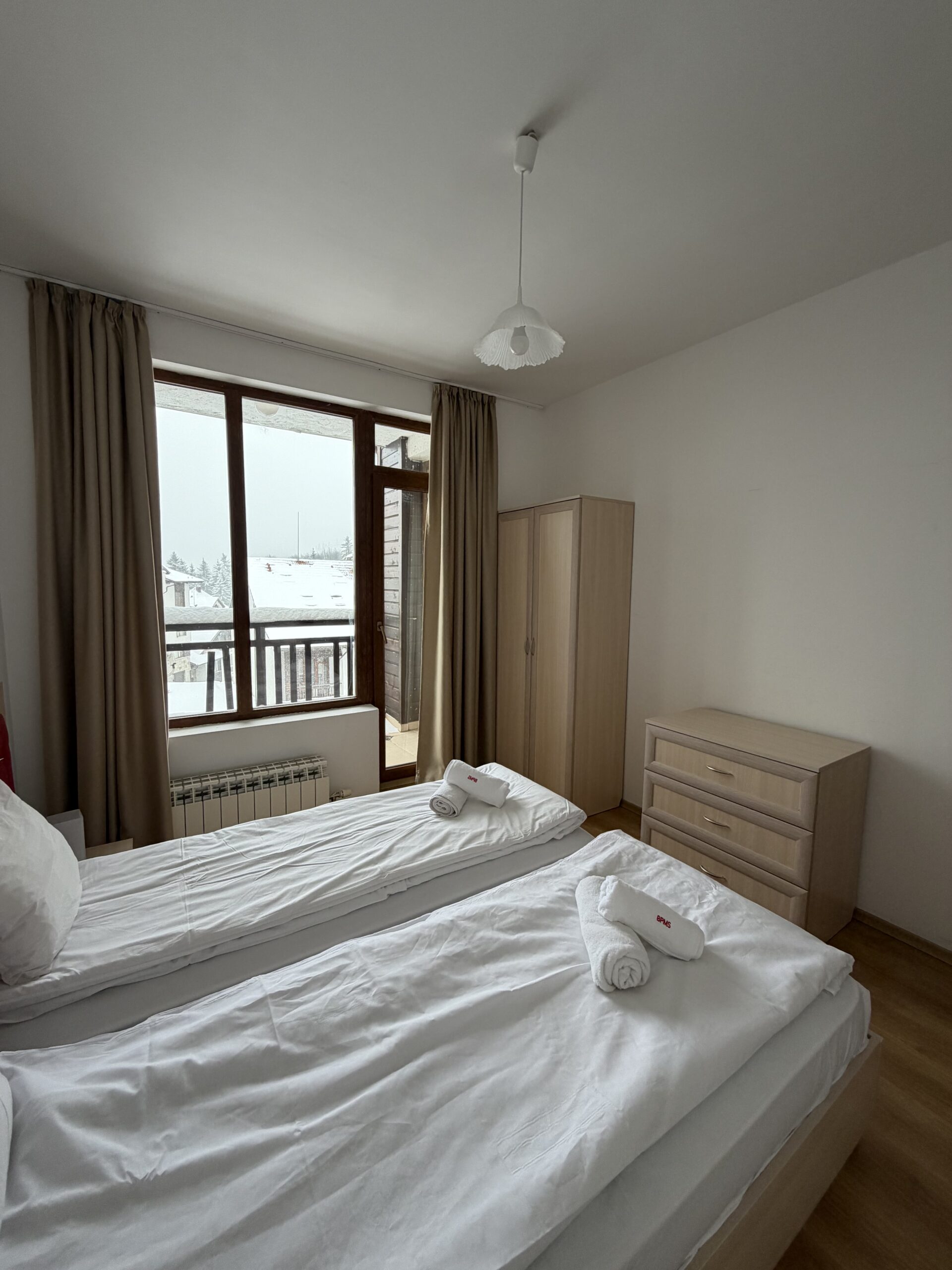 Accommodation: Apartment 178 is situated in C wing on the 7th floor and overlooks the pine forest and mountain slopes. The apartment is sunny and very comfortable, spacious and accommodates 4 persons. The apartment comprises of large hallway with storage space, sofa bed including mattress topper , dining-table for 4 people, fully equipped kitchen area providing cable TV, DVD, 2 hot plates, oven, fridge, toaster and kettle. Double bedroom with two single beds, wardrobe with small balcony. A bathroom with bath. A balcony reveals wonderful pine forest and mountain view. The apartment is centrally heated. Cotton bedding and towels provided. Cleaning schedule: