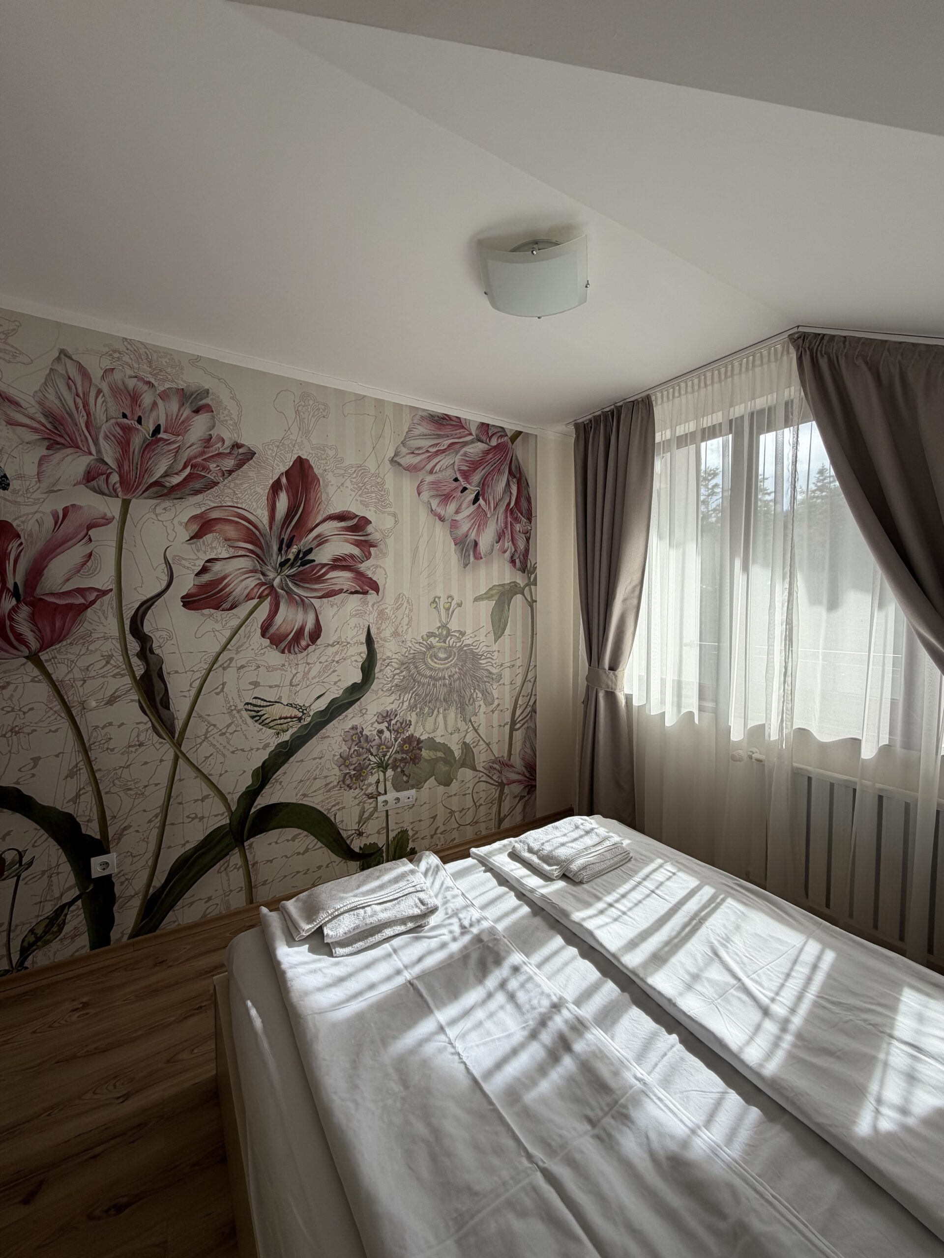 Accommodation: Apartment C55 is situated on the 6th floor and overlooks the pine forest. The apartment is very spacious and sunny, comfortably accommodates 4 people. The apartment comprises of a hallway with storage space, living-room with sofa bed including mattress topper, fully equipped kitchen area providing cable TV, 2 hot plates, fridge, electric kettle, toaster and microwave. Bathroom with bath and shower . One spacious bedroom with double bed, ample storage. The apartment is centrally heated. Cotton bedding and towels provided. Cleaning schedule: