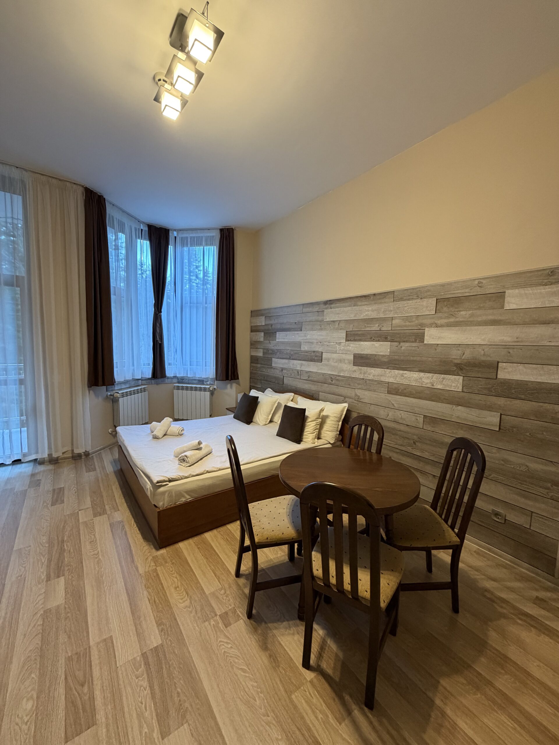 Flora Hotel & Apartment Complex is located in the central part of Borovets ski resort, just 100 meters from the central station of the cabin lift Yastrebets and the four chair lifts Martinovi baraki and Sitnyakovo Express. At 500 meters from the hotel complex is the Royal Bistritsa residence with it’s park open for visitors.The hotel complex comprises of  main building and five situated among perennial pines buildings with apartments. The complex is designed to satisfy the needs of different types of tourists: ski lovers, and cultural tourism as well as recreational mountaineers.