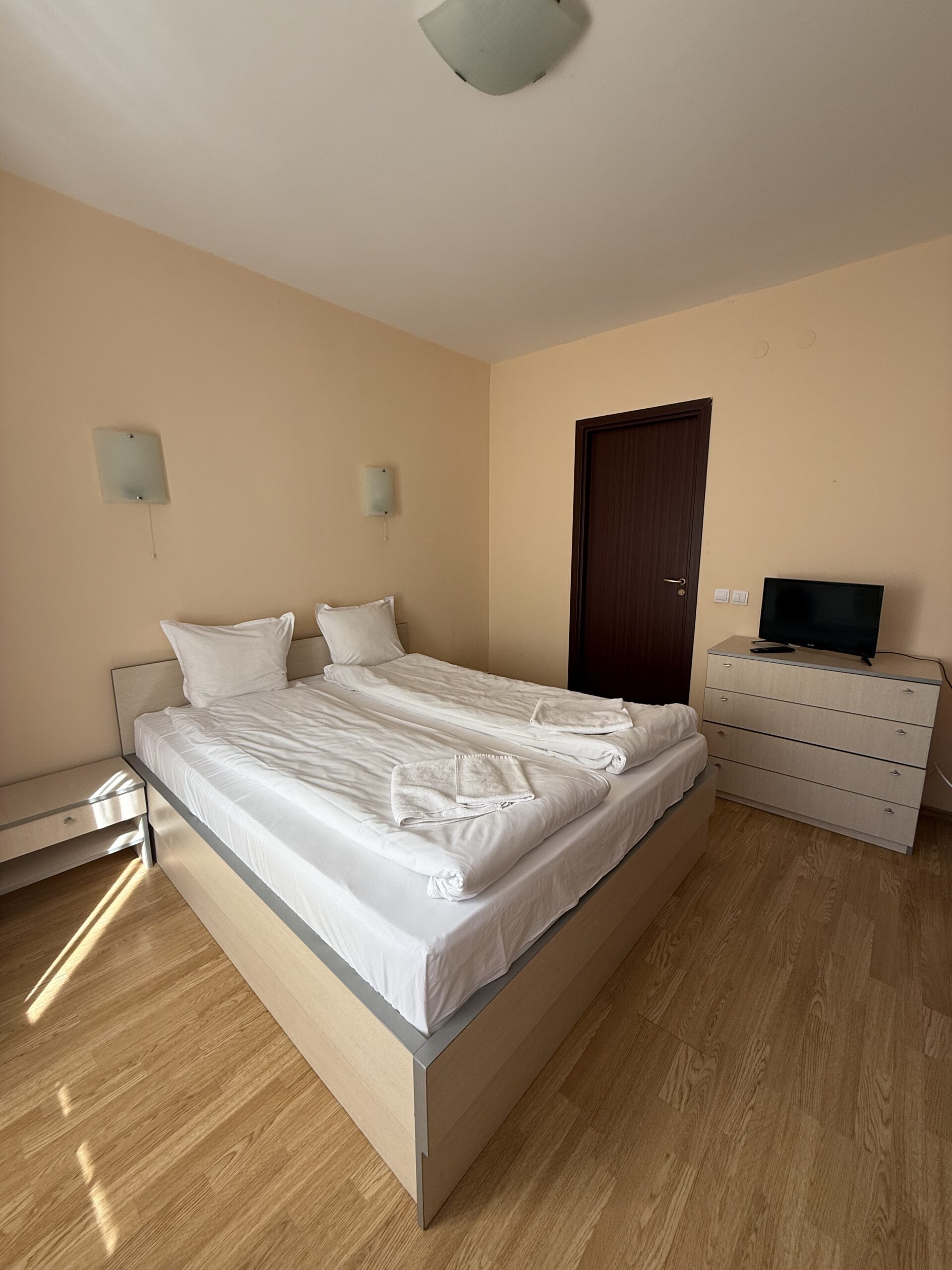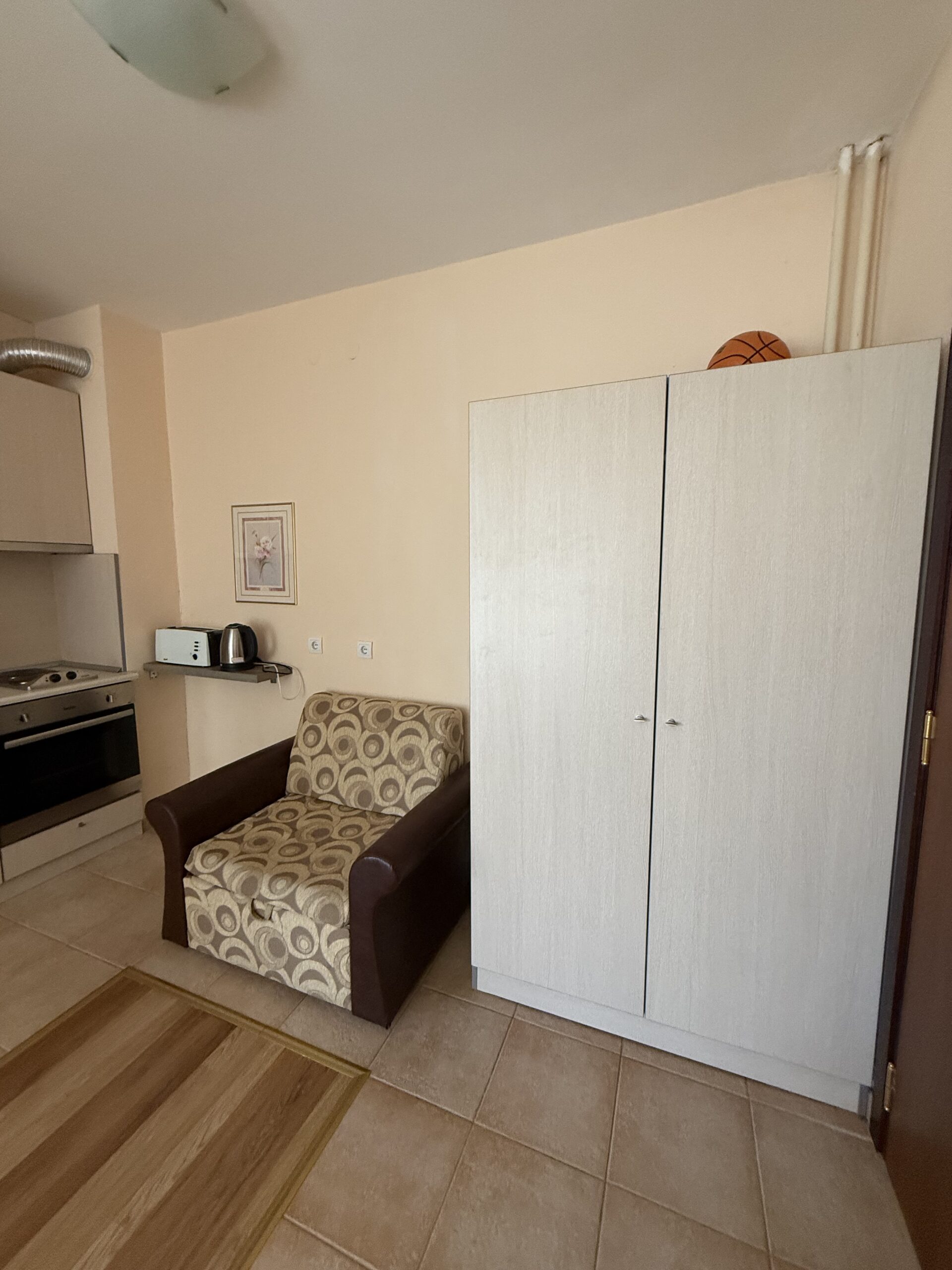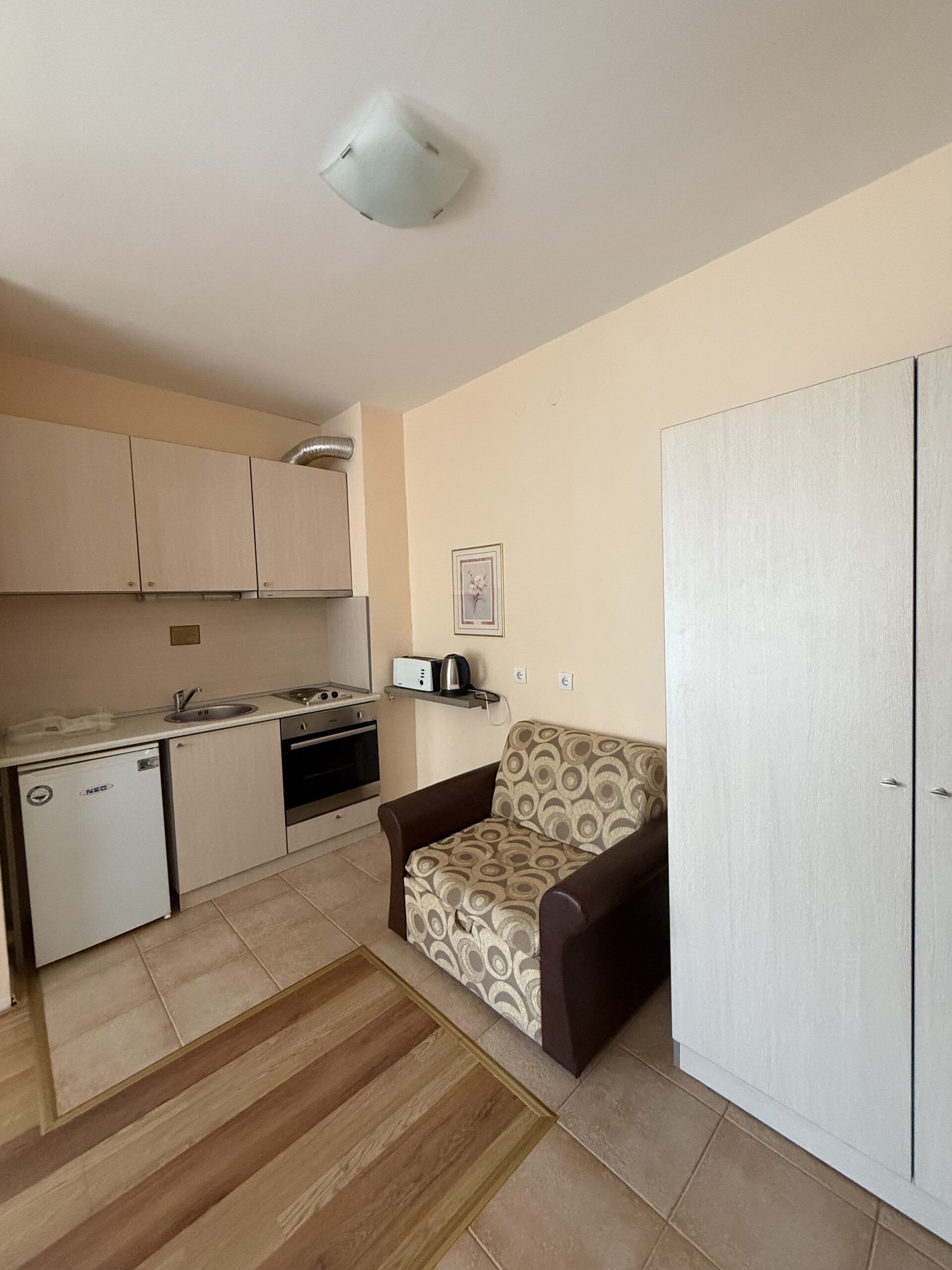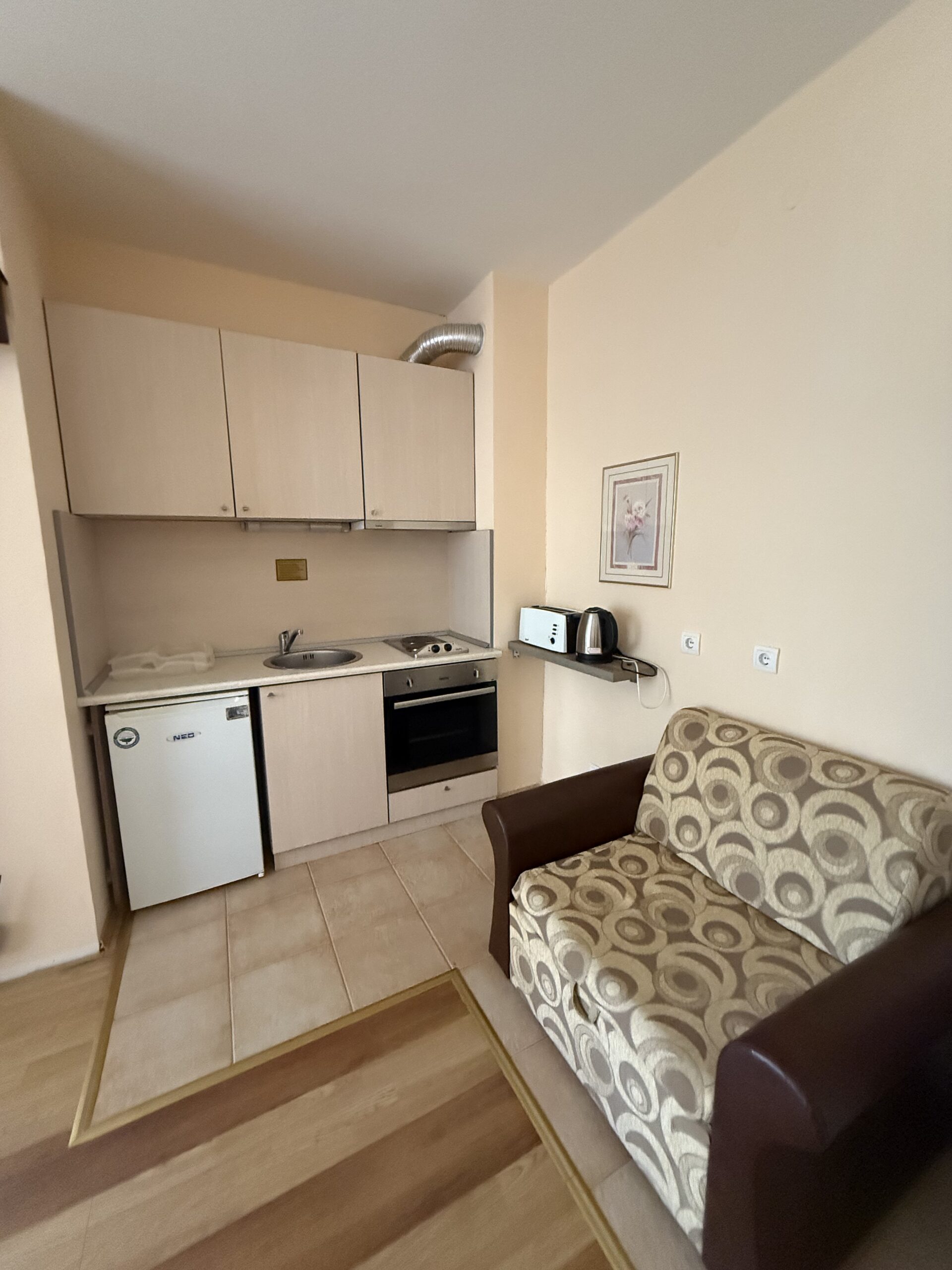 Accommodation: Studio 12 is situated on the 2nd floor in Violet building, one of the five buildings behind main Flora, part of Flora Residence complex. The studio comfortably accommodates 2 persons and even 3 adult on extendable sofa. Comprises spacious room with storage space, sofa, double bed, flat screen TV with cable channels. Smart fully equipped kitchen area with 2 hot plates,oven, fridge, kettle, toaster. Large bathroom with bath. The studio is centrally heated. Bedding and towels provided. Cleaning schedule: