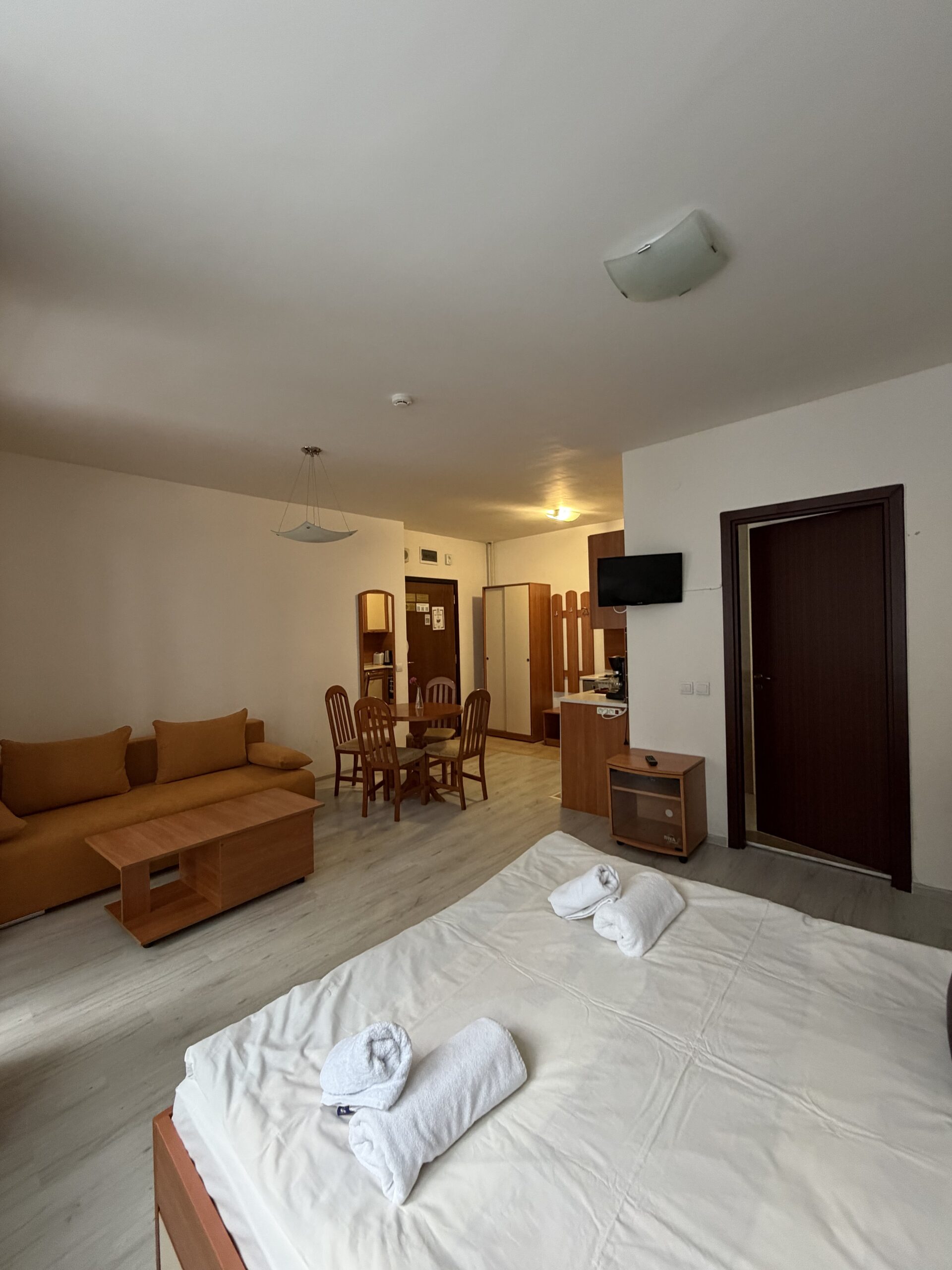 Accommodation: Studio 16 is situated on the 3rd floor in Violet building, one of the five buildings behind main Flora, part of Flora Residence complex. The studio comfortably accommodates 2 persons and even 3 adult on extendable sofa. Comprises spacious room with storage space, sofa including mattress topper , double bed, dining table with chairs, cable TV, DVD. Smart fully equipped kitchen area with 2 hot plates, fridge, kettle, oven toaster. Large bathroom with bath. The studio is centrally heated. Bedding and towels provided.Cleaning schedule: