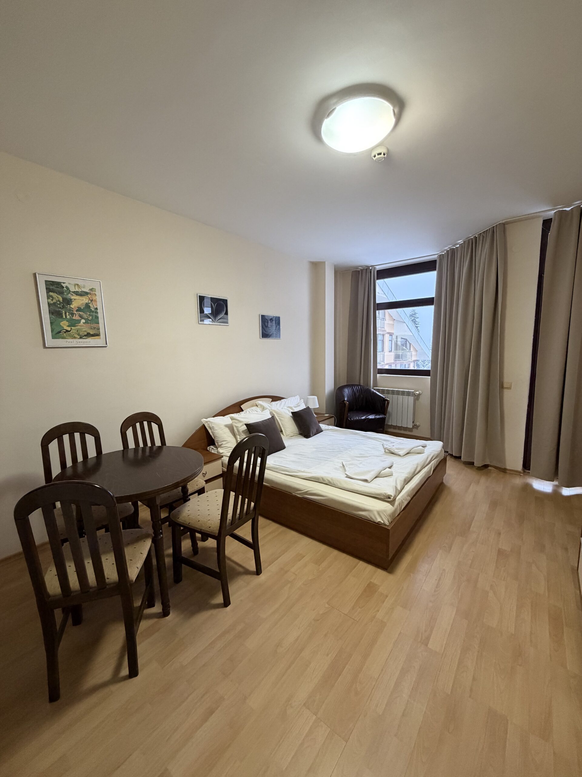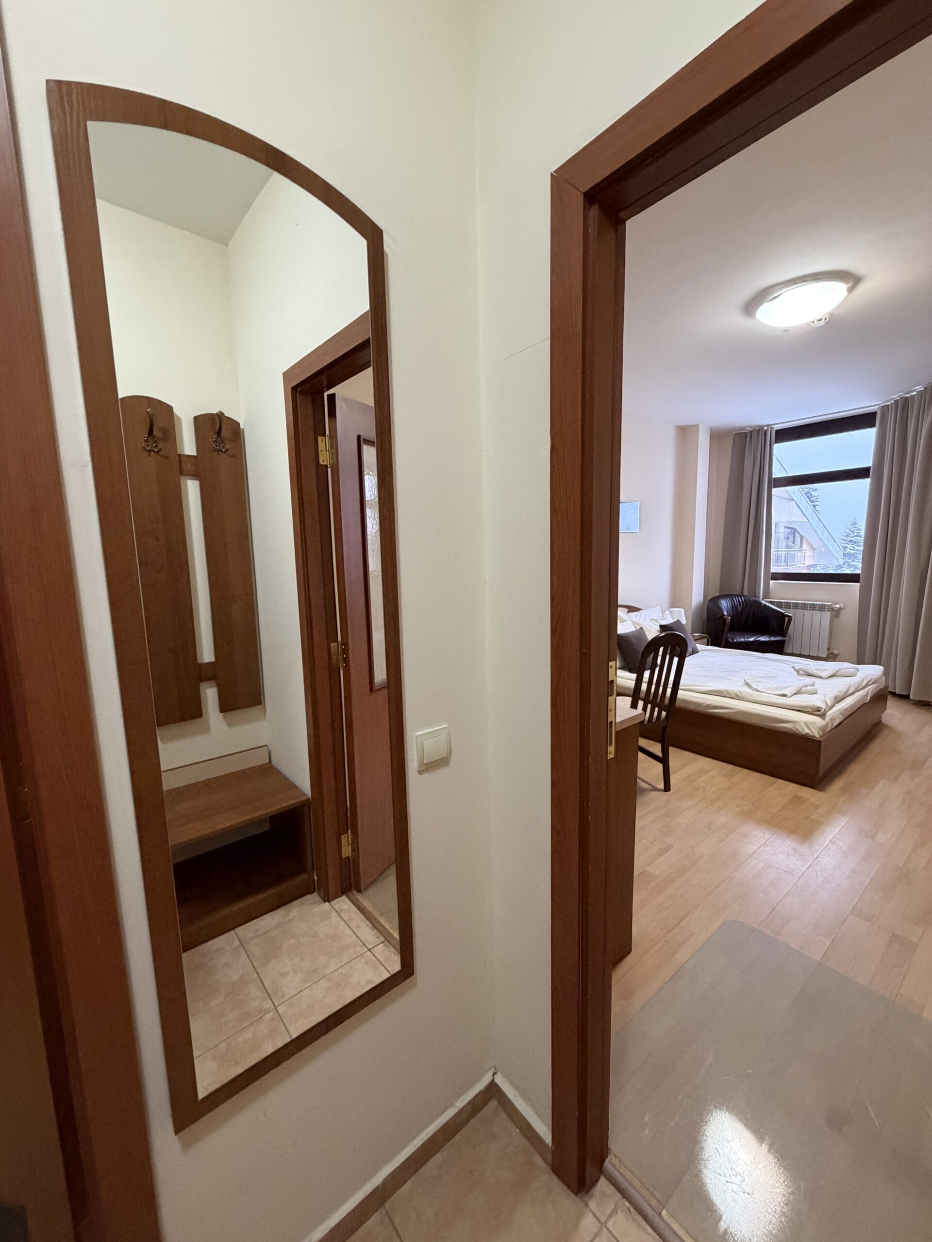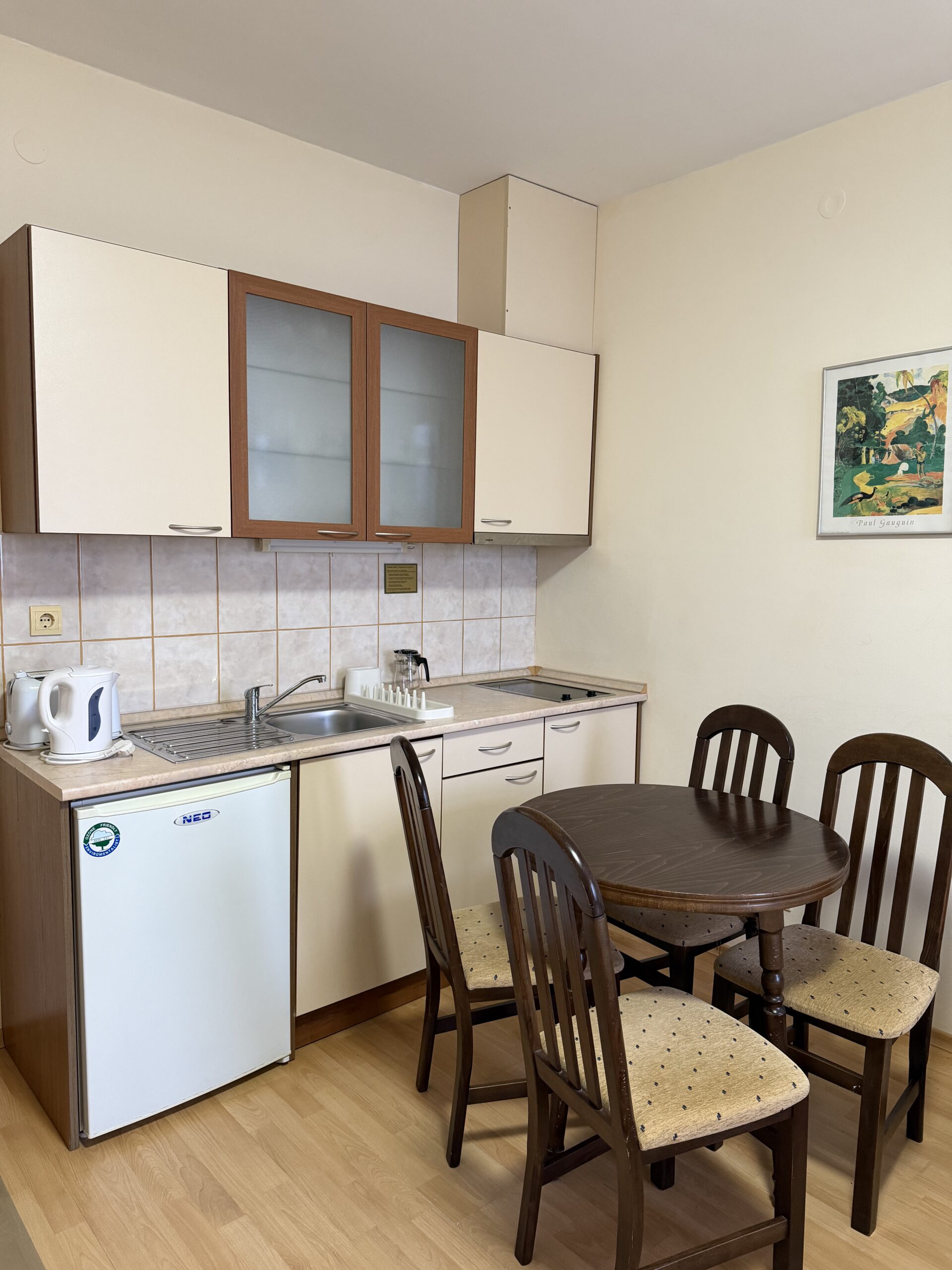 Accommodation: Studio 501B is situated on the 5th floor in the main Flora building with direct lift access to all indoor hotel facilities and overlooks the car park and Gondola lift. The studio comfortably accommodates 2 people. Comprises hallway with storage space and dining table for 4 in the living area, large double bed, cable TV, DVD. Smart fully equipped kitchen area with 2 hot plates, fridge and electric kettle. Large bathroom with bath. Sunny balcony offers green view and fresh air. The studio is centrally heated. Cotton bedding and towels provided. Cleaning schedule: