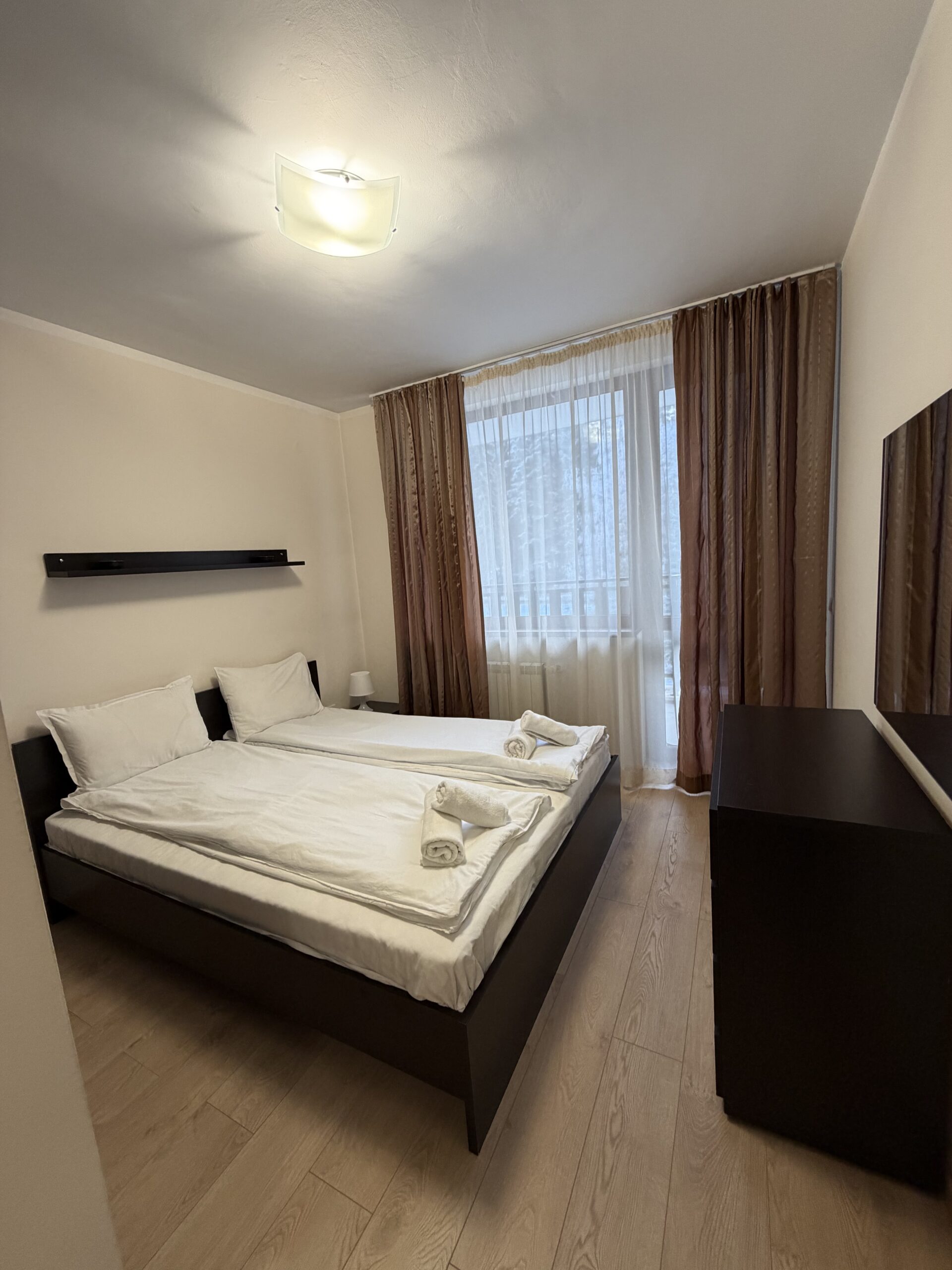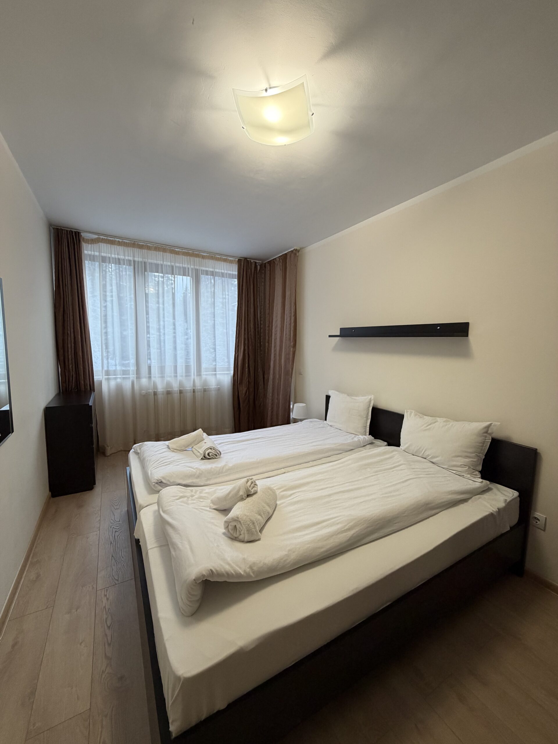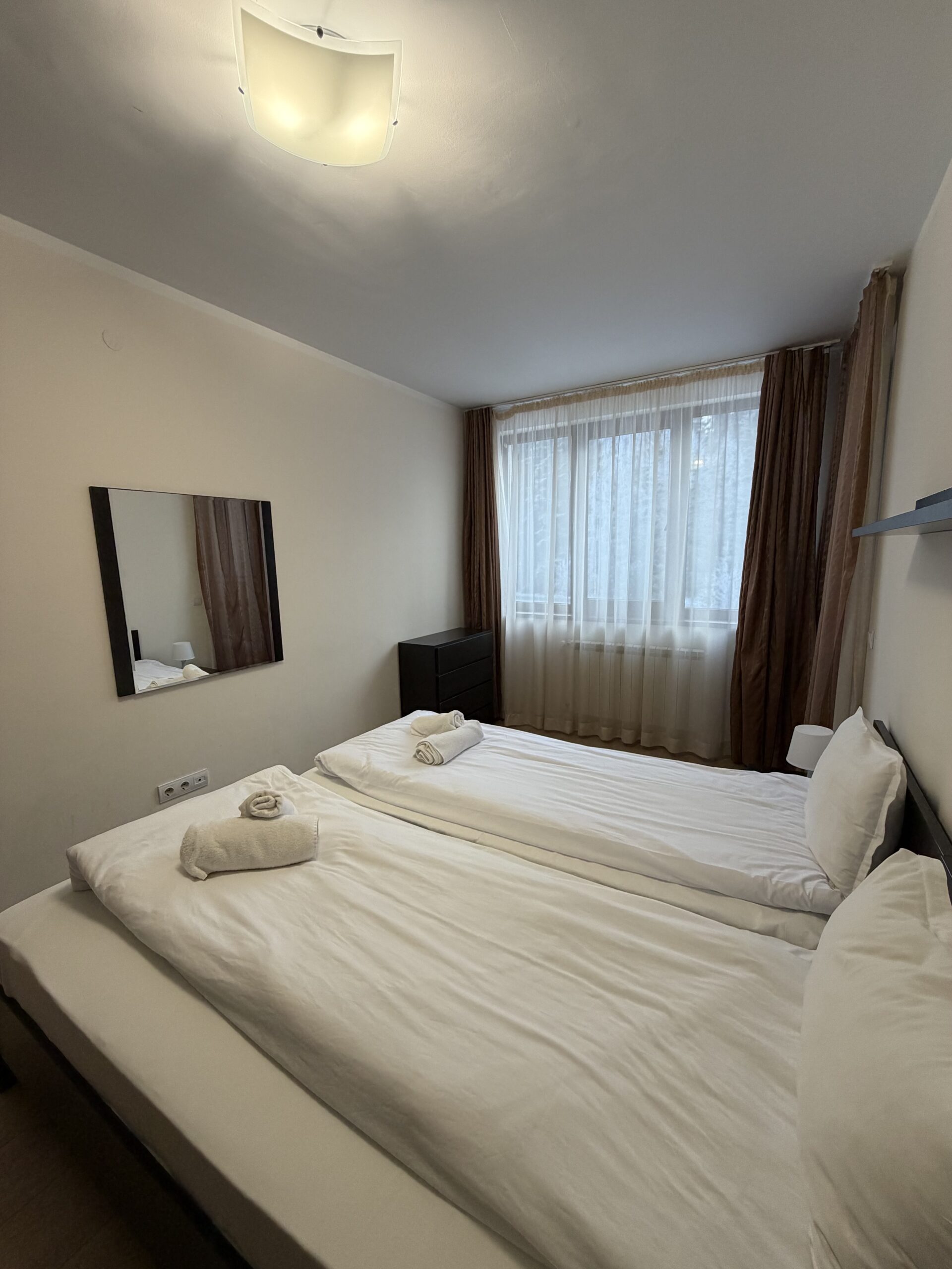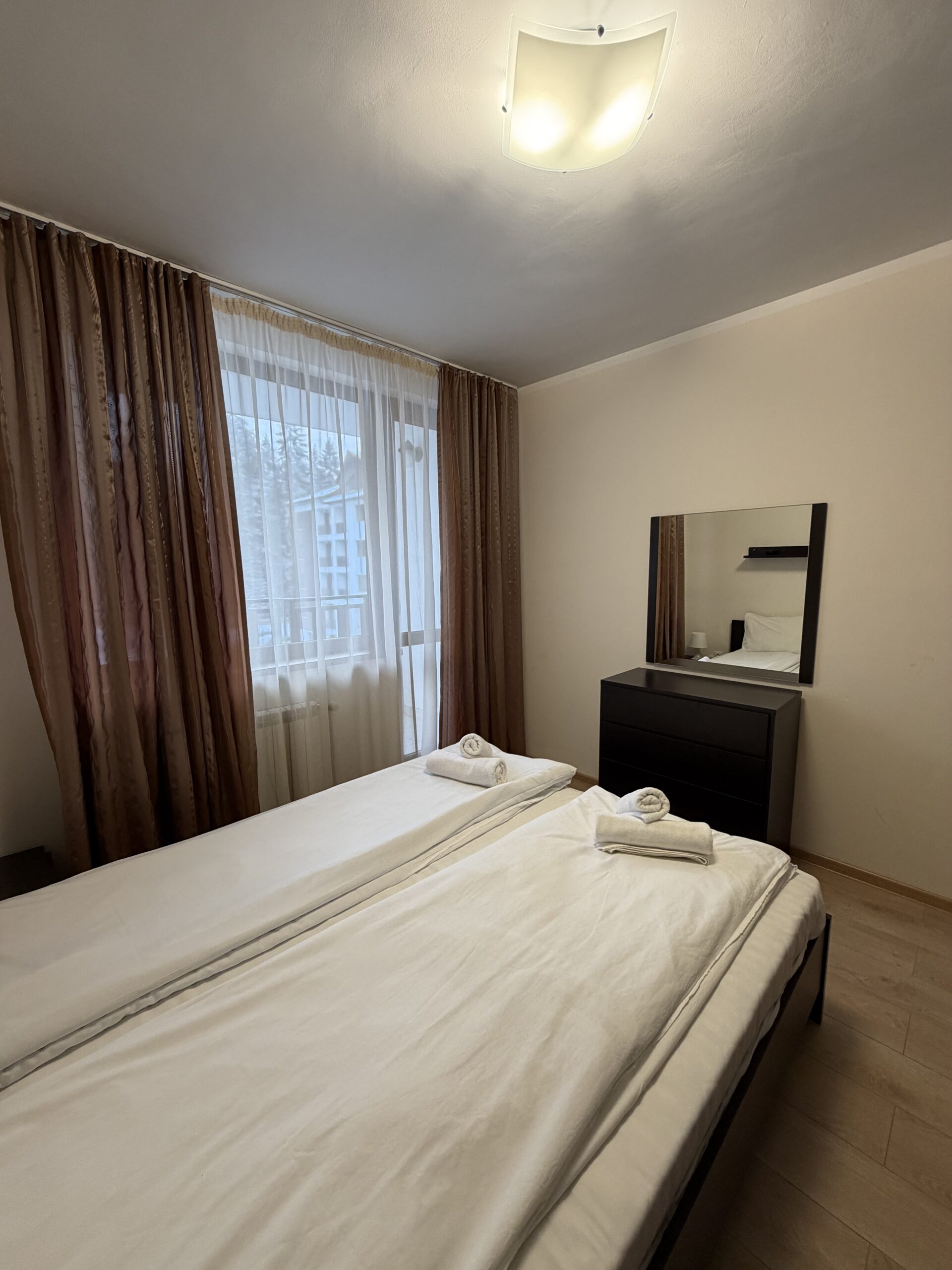 Accommodation: Apartment C27 is situated on the 3rd floor and overlooks the pine forest. The apartment is very spacious and sunny, comfortably accommodates 6 people .The apartment comprises of large hallway with storage space, living-room with sofa bed including mattress topper, dining-table for 4 people, fully equipped kitchen area providing cable TV, 2 ceramic hobs, fridge, toaster and kettle. 1 bathroom with bath and 1 separate toilet room. One spacious double bedroom with king size bed and second bedroom double bed, ample storage. Small balcony reveals wonderful pine forest and mountain view .The apartment is centrally heated. Cleaning schedule: