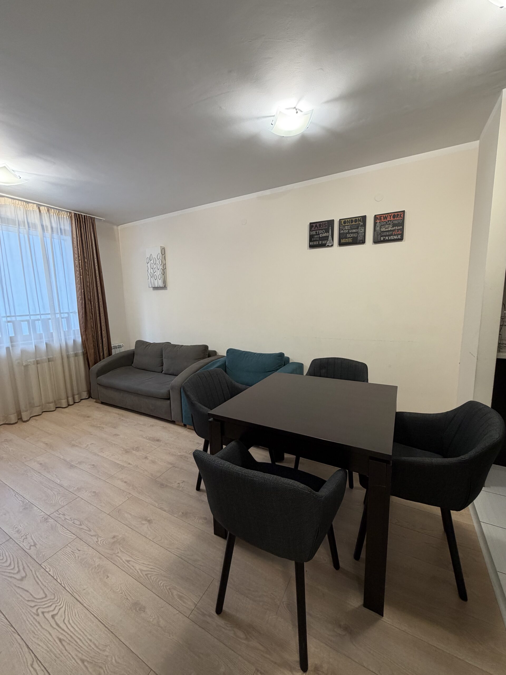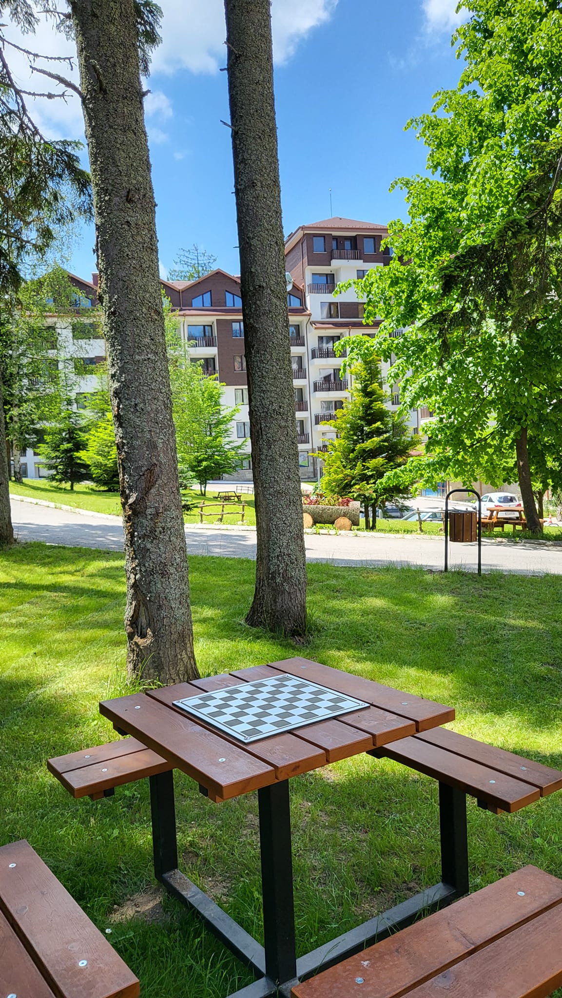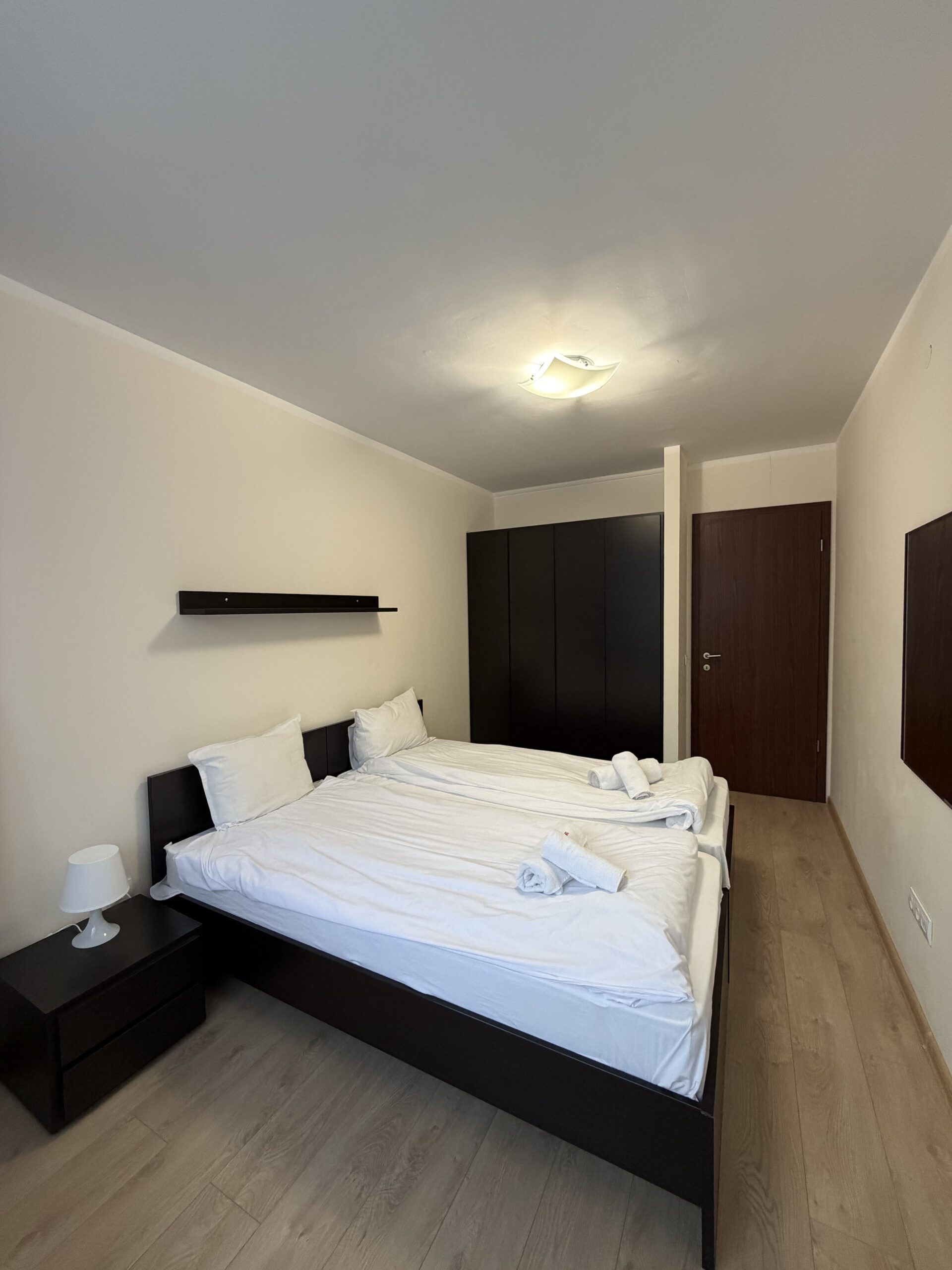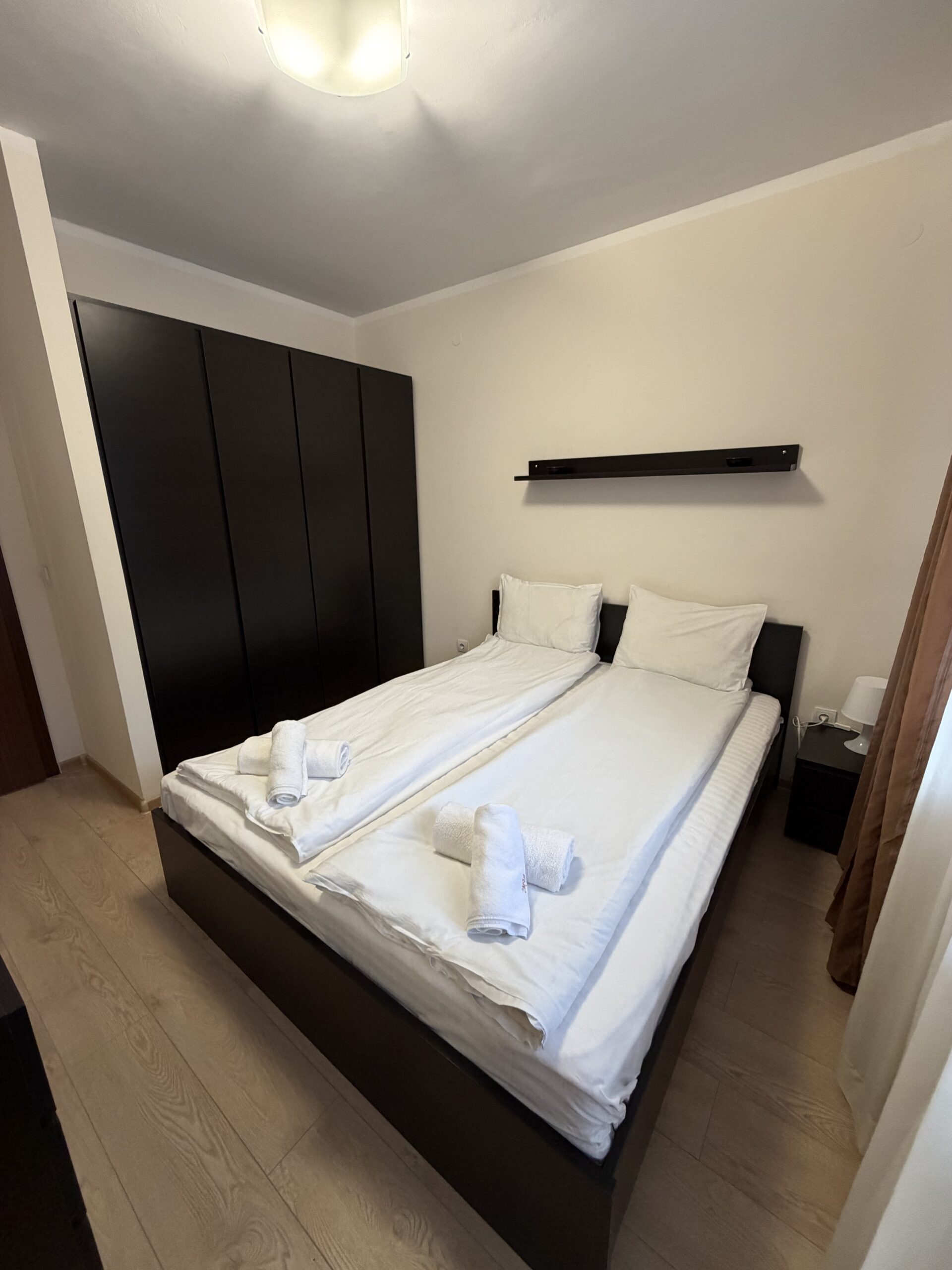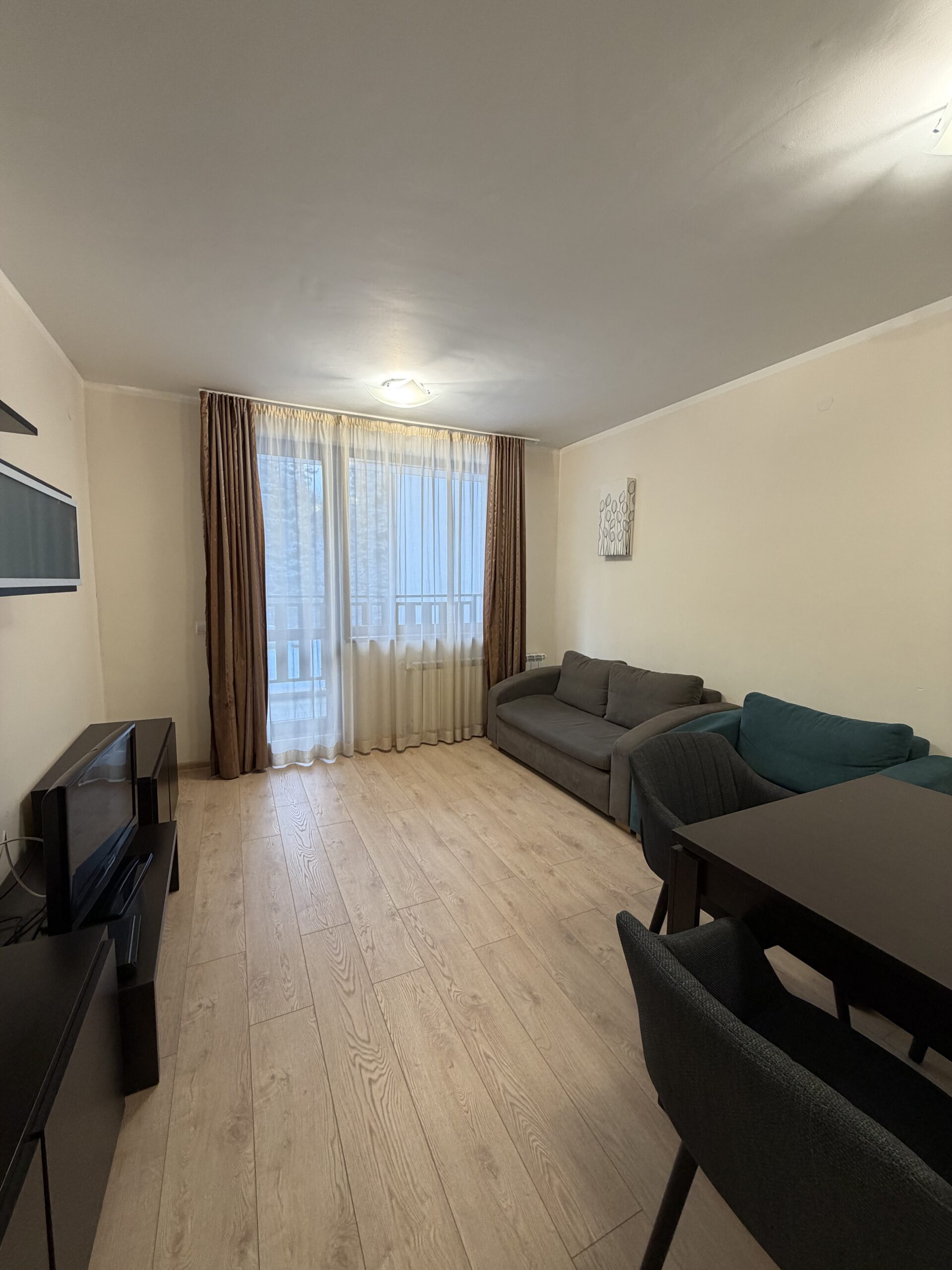 Accommodation: Apartment C27 is situated on the 3rd floor and overlooks the pine forest. The apartment is very spacious and sunny, comfortably accommodates 6 people .The apartment comprises of large hallway with storage space, living-room with sofa bed including mattress topper, dining-table for 4 people, fully equipped kitchen area providing cable TV, 2 ceramic hobs, fridge, toaster and kettle. 1 bathroom with bath and 1 separate toilet room. One spacious double bedroom with king size bed and second bedroom double bed, ample storage. Small balcony reveals wonderful pine forest and mountain view .The apartment is centrally heated. Cleaning schedule: